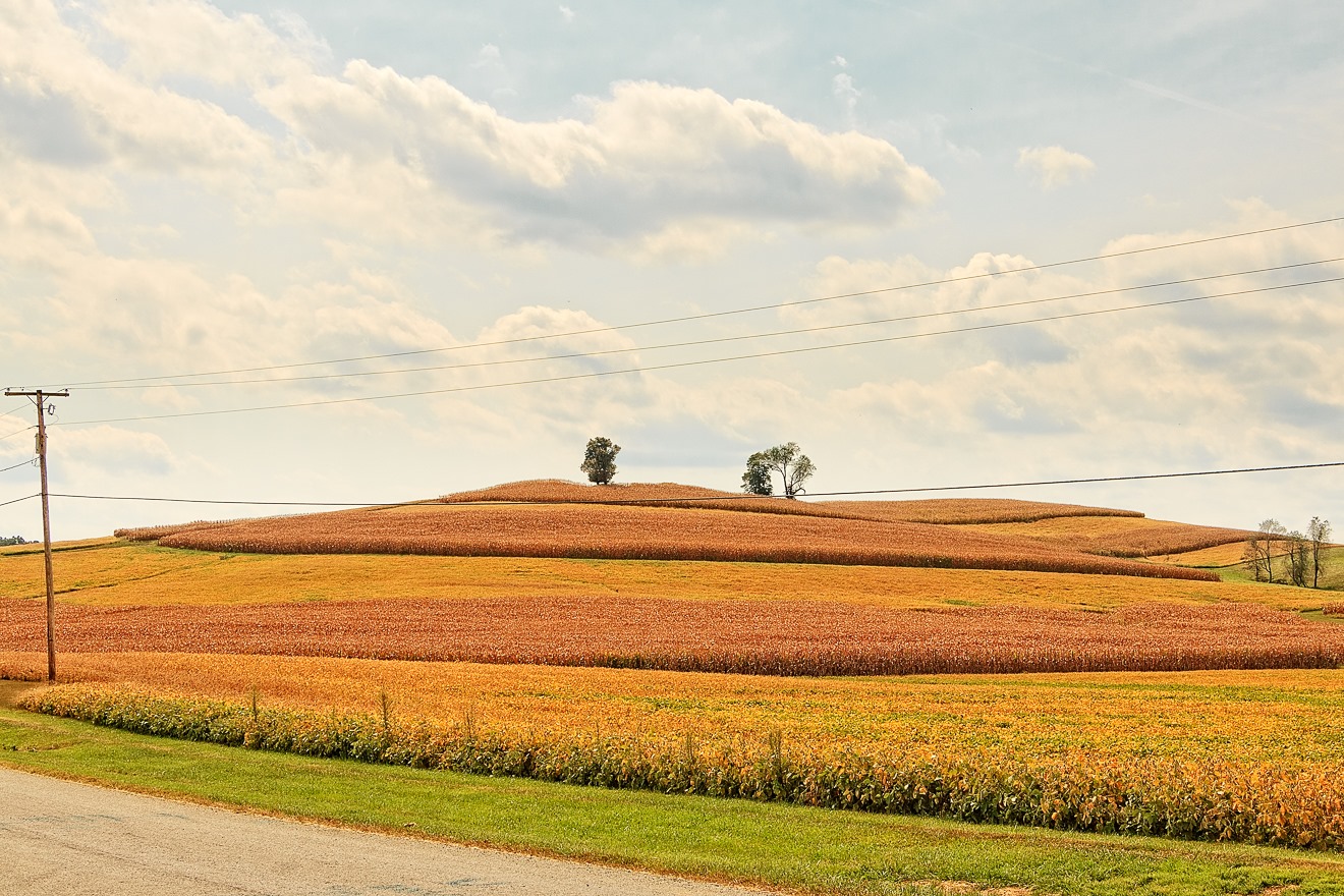 One of the interesting thing (to me) that you sometimes see with Ohio farmland are alternating strips of farmland, switching back and forth from one crop to another—typically corn and hay or corn and soybeans. This creates interesting patterns of color and texture.