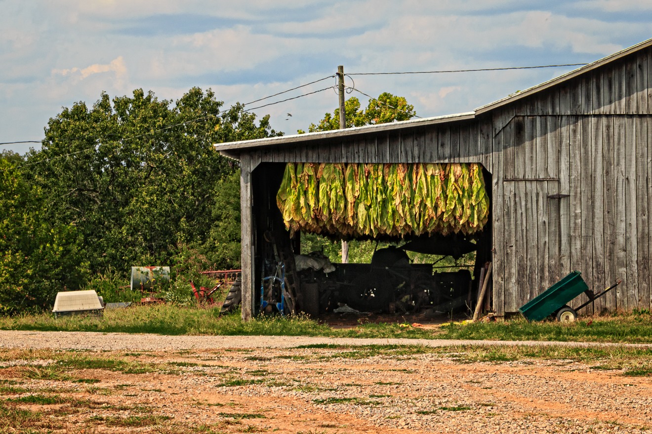 Far southern Ohio has a climate that is somewhat suitable for tobacco cultivation, so you’ll sometimes see tobacco plants in the field or, as here, drying in a shed. I have only seen small fields, never large tobacco fields, so this is probably a sideline for farmers in the area rather than a crop they depend on.