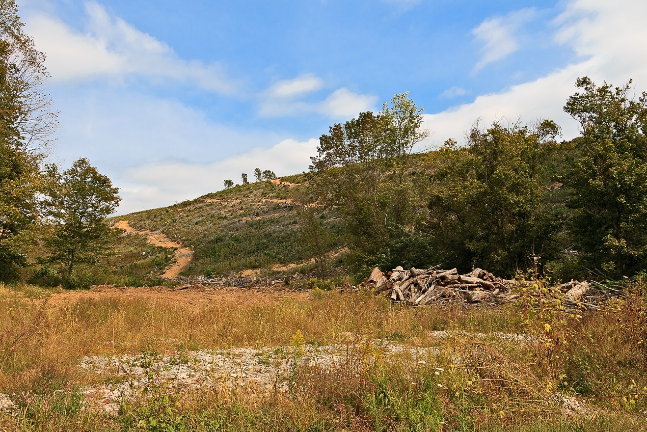 I wasn’t very far outside of Chillicothe before I encountered something quite striking—though not necessarily in a good way. I came across the side of a hill that had been totally clearcut. All the trees, all the brush, had been removed from the entire hillside, almost like a giant mower had swept up and down the slopes. Only a few spindly stalks somehow escaped the green reaper. In my previous excursions, there were one or two times when I saw what might have been clearcutting, and I had seen areas of woods that were obviously still recovering from a past clearcutting, but this was the first time I had come across such a recent and obvious episode of clearcutting and it did not make me happy.