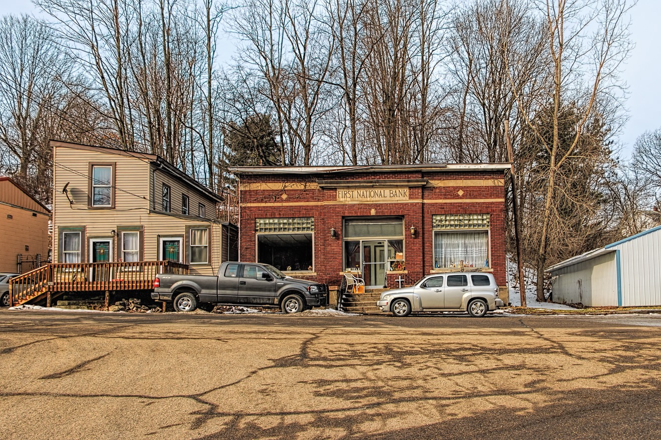To the west of Smithfield is Hopedale, Ohio, a parvenu compared to some of the older places we’ve seen—Hopedale only popped up in 1849.  Its population today is 950 (salute!).  Like Smithfield, Hopedale has had a weird population history—but in the other direction.  In 1990, its population was only 685, but by the 2000 census it had leapt all the way to 984, a 43.6% increase.  It is as if all the people who left Hopedale wandered in the Appalachian wilderness for 10 years then wound up in Hopedale.  I find it very puzzling.  Here we see what was at one point the First National Bank of Hopedale.  This bank opened in 1903.  As a national bank, it had the ability to print U.S. currency, which seems rather odd today.   By the 1990s, it had become a branch of Heritage Bank and moved to a different building.