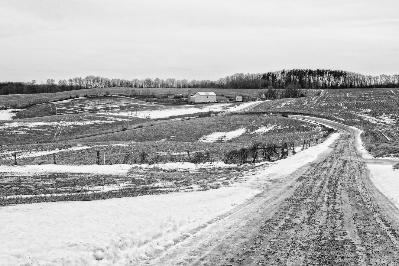 Here’s a look down an icy, icy gravel road onto some frigid farmland.  And with this glimpse of the eastern Ohio landscape—a relatively flat portion of it—we will end this half of the excursion.  Tune in tomorrow—or whenever I get around to posting the second half of this journey.  Pat yourself on the back if you made it all the way to the end!
