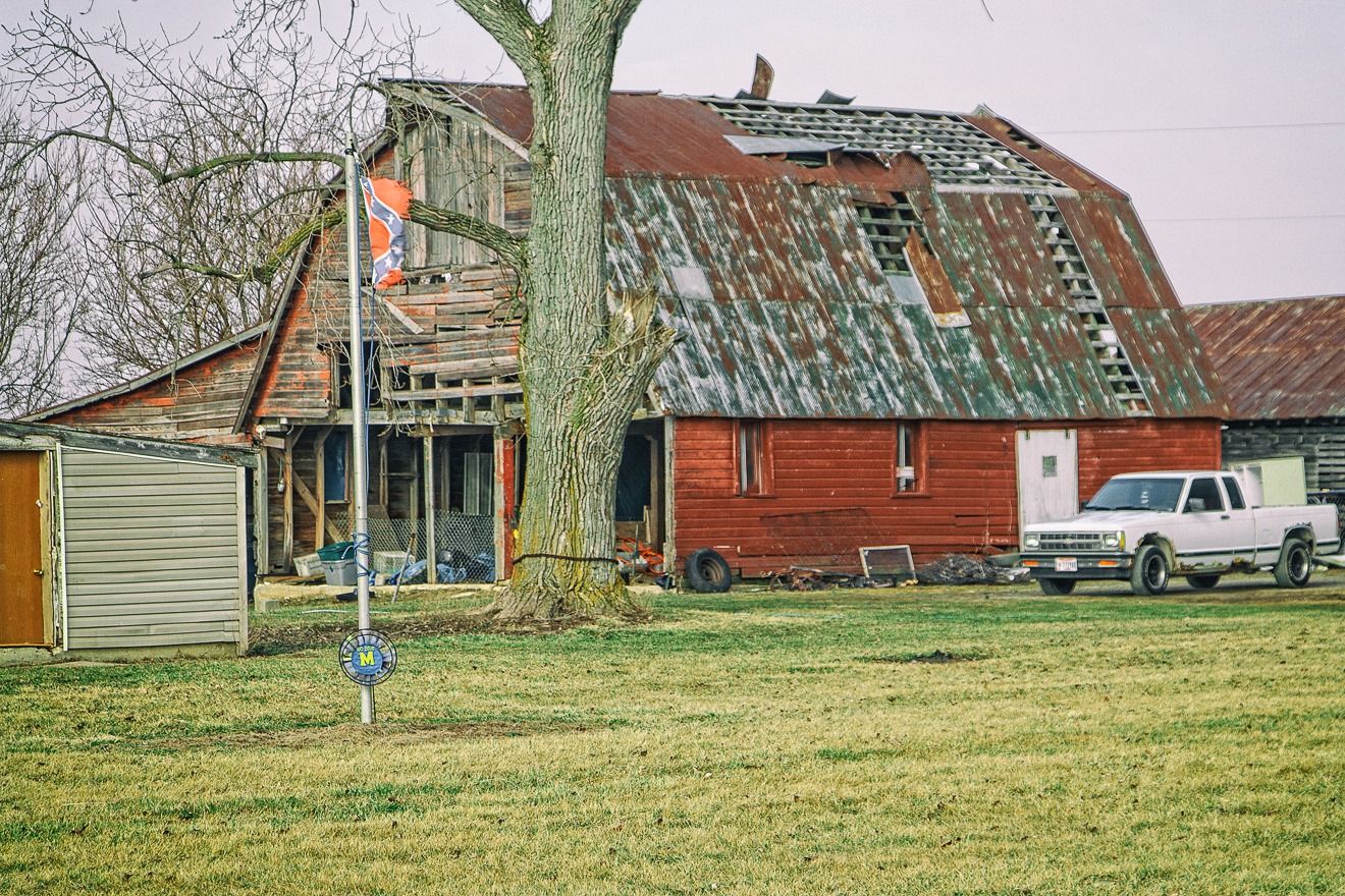 I could tell Spring was indeed springing, as this was a typical very windy early spring day. Wind is not usually the photographer’s friend, and certainly not the friend of the amateur photographer like me. But the wind did help me capture this image of the tattered remnants of a Confederate flag still flapping in the stiff breezes. Confederate flags are, sadly, all too common in rural Ohio, especially southern Ohio.