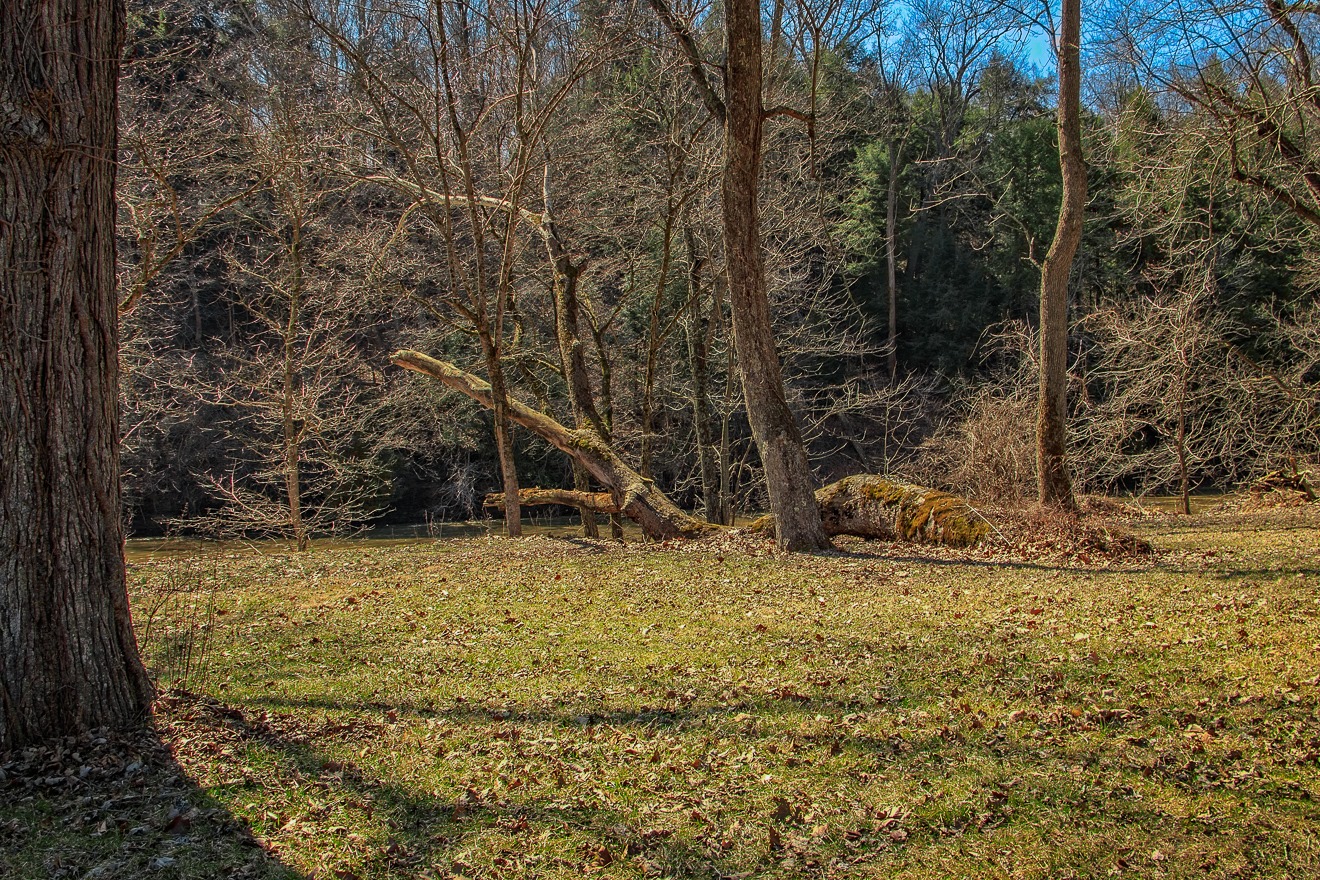 Running to the east and south of Chillicothe is Paint Creek, seen in the background here, before it joins the Scioto River, the major river in central Ohio. I took this photograph to illustrate a phenomenon I constantly see along streams and rivers in Ohio (and, I’m sure, everywhere), which are trees that bow down towards the river. I presume, but have no actual knowledge on which to base this assumption, that such trees bend towards the body of water because the soil near the water is softer and the weight of the tree causes it to tilt. Although in such cases, one would think that a tree would be as equally likely to bend to the side as it would to the water. So it remains a bit of a mystery to me.