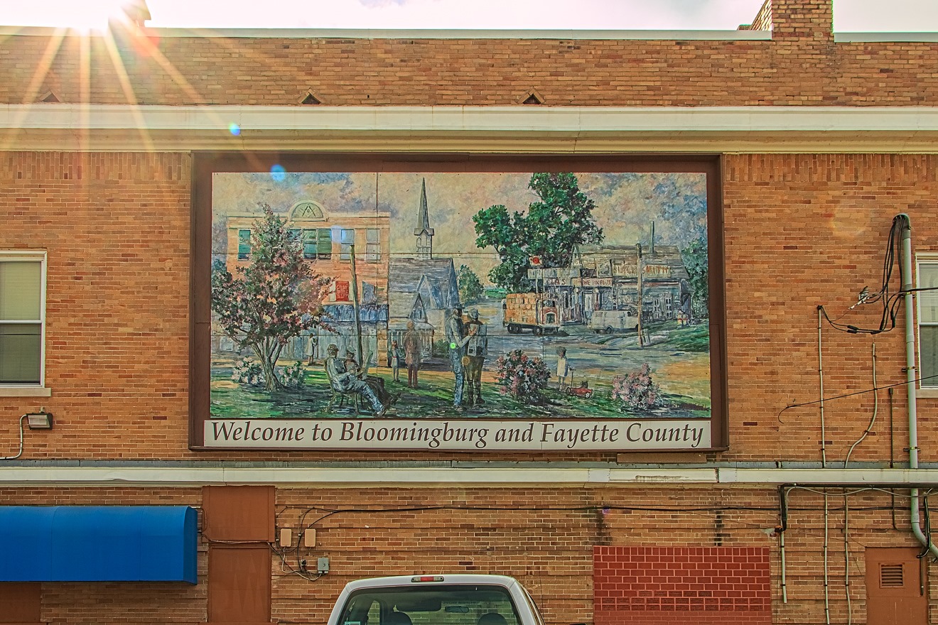 I passed through Bloomingburg quite quickly, but stopped to take a memento in the form of this welcoming sign. Bloomingburg is a tiny (population 938, salute!) village in Fayette County. Based on the activities of the subjects of the painting, they must have been big newspaper readers in bucolic Bloomingburg.