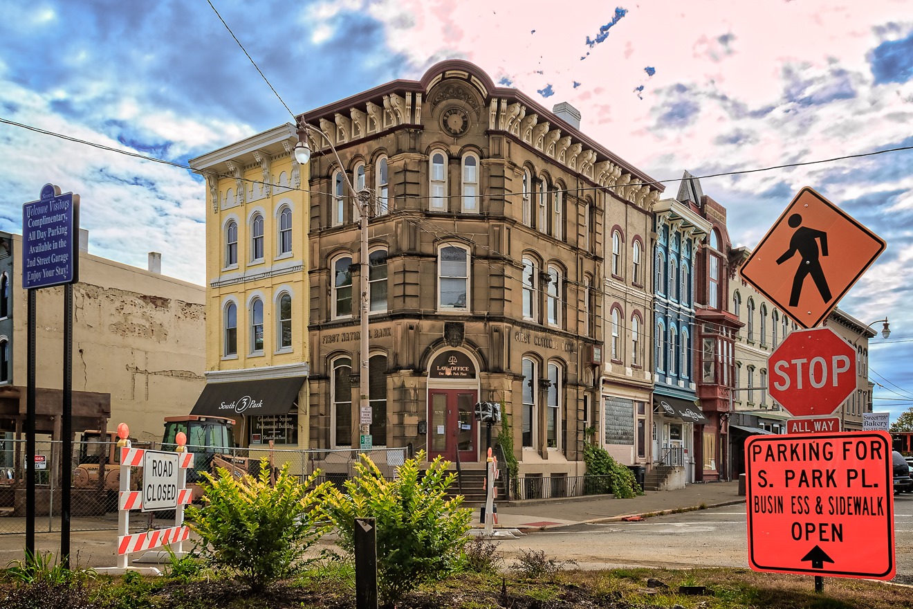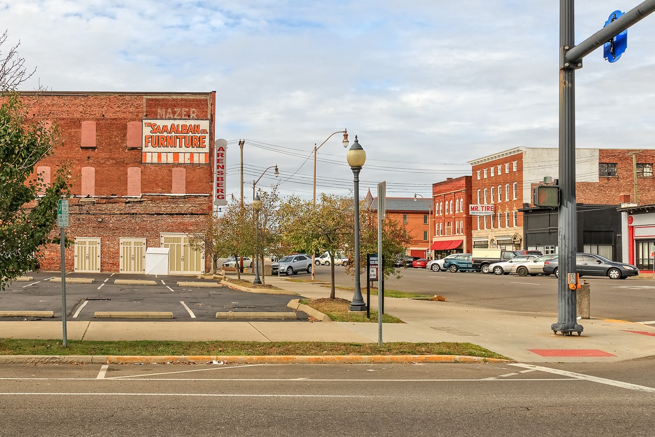 One final shot from Newark before we head out into the countryside, a shot of what was the Sam Alban Furniture Company, though there is also a sign that cryptically says ‘Arensberg,” which I think is a local pharmacy chain. It may occupy what used to be the Sam Alban company, which went out of business in 2008 (many decades after its opening in 1935). It was a victim of the Great Recession of 1908. The old sign on the side of the building was probably an ad for the 1930s-era Mazer Cigar Company out of Detroit.
