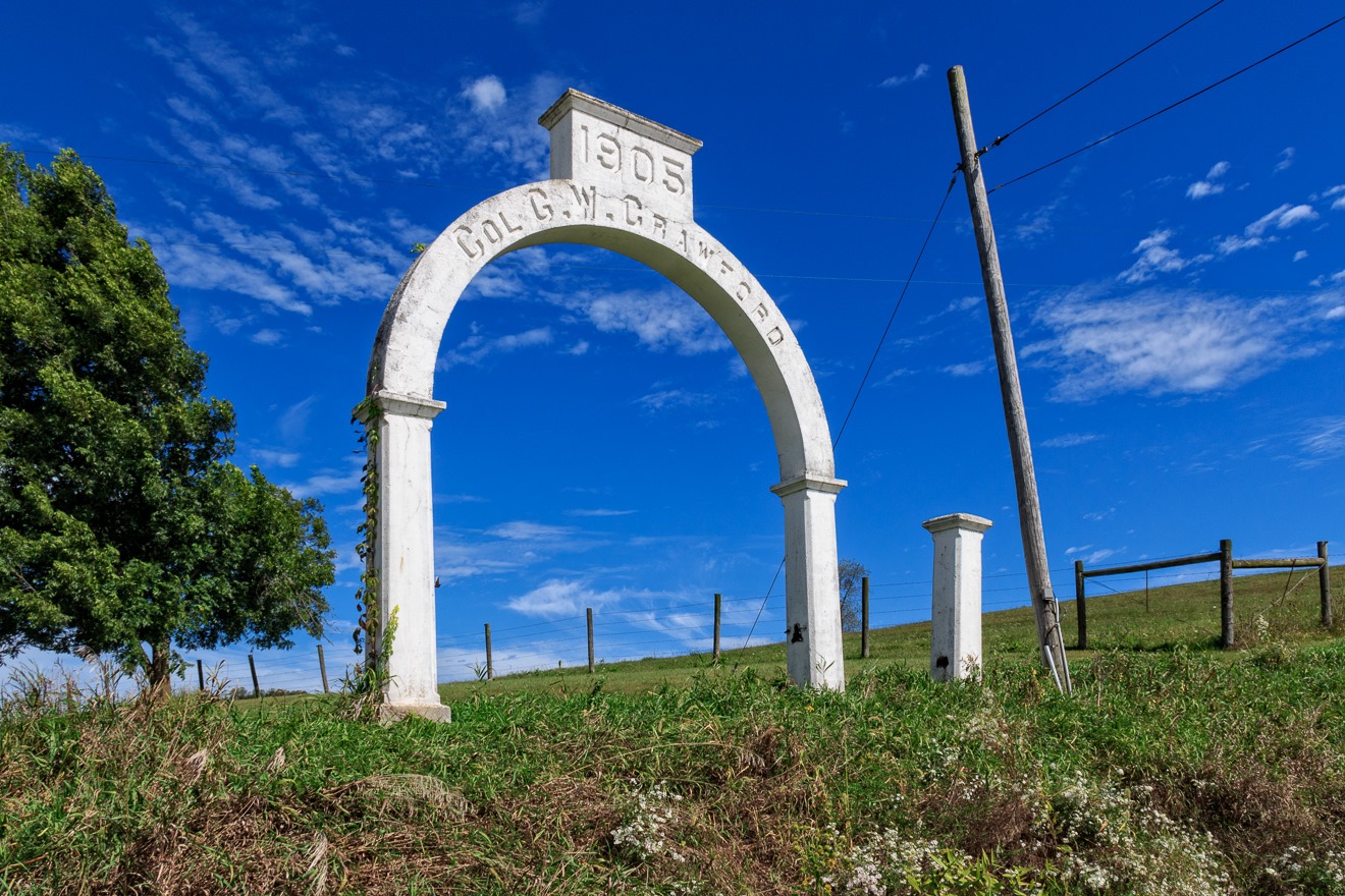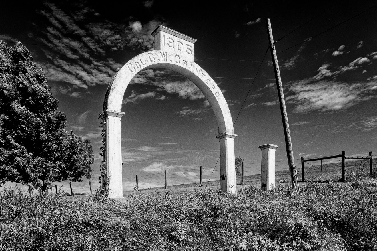 We have definitely moved from the industrial to the agricultural, haven’t we? That’s what this arch represents, as well, though I did not know it at the time—I took a photograph of it because it was dynamic and unusual. But this appears to have been the entrance to what once was the Sharon Valley Stock Farm, the domain of one of the preeminent horse breeders in the United States, Col. George W. Crawford (1845-1915). Crawford bought a farm outside of Newark, Ohio, in 1879 and began to raise horses, eventually specializing in Belgian and French draft horses. Crawford made over 70 trips to France and Belgium in his lifetime, to obtain new stock as well as to sell his highly respected horses–one estimate from the early 1900s suggests he paid more than $10,000,000 in buying and selling such horses (including freight). In 1908, Crawford was “presented” at the court of the King and Queen of Belgium and King Leopold later knighted him as a Chevalier D’Orde D’Leopold. In the last years of his life he sold many horses to France, Belgium and Italy for the war effort. I guess if I had done all that I’d have build a damn arch, too.