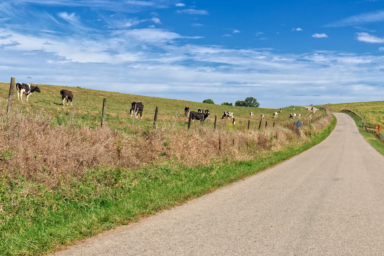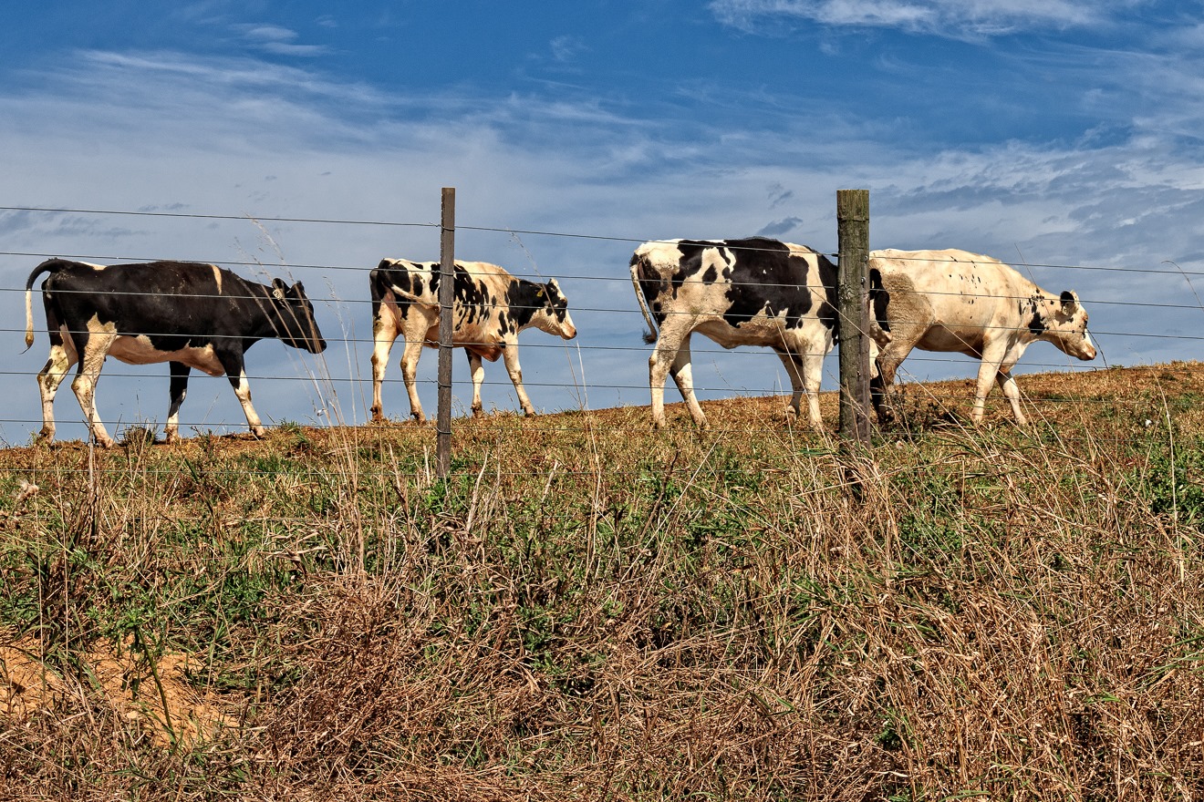 One thing you may notice if you drive around a lot of hilly pasture land is that many of the hills seem almost terraced. This is because cows tend to walk out to graze in a line and, over time, they wear paths or even long “steps” into the side of pasture hills. Here is an example of the cows walking out in a line to graze somewhere.