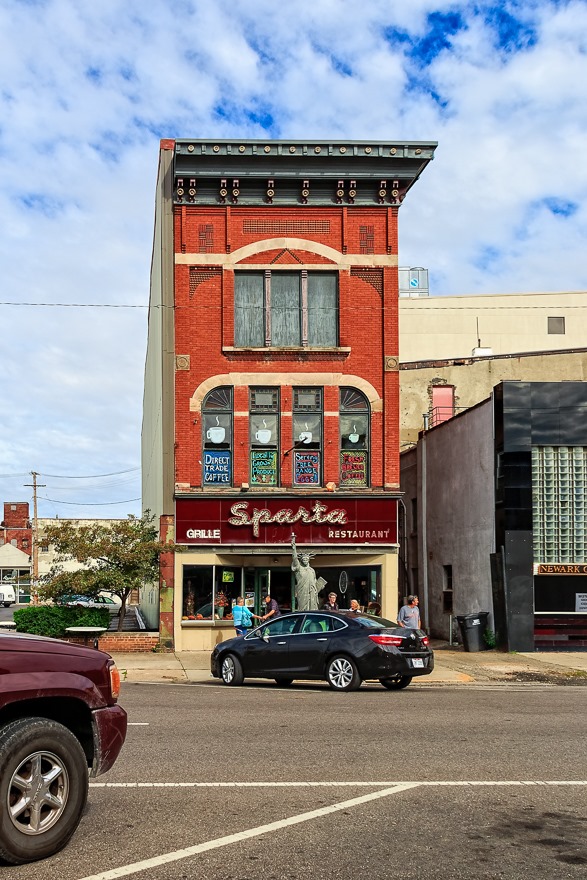 Newark, a very attractive place, has lots more than just old factories. One thing it has is the Sparta Restaurant, a rather distinctive looking place. This is a non-profit “business” designed to provide employment for former inmates. The building itself, erected in 1903, has housed everything from restaurants and bars to hardware stores and candy shops in the past. Now it is a good place to get chicken and waffles.