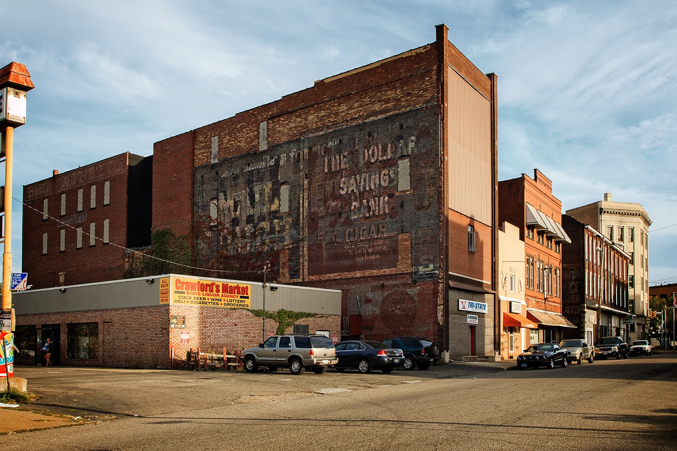East Liverpool reached its peak of prosperity and influence as a manufacturing town in the early 20th century and remnants of that past century’s former glory are constantly visible in the town today (a town that has only half the population it had a hundred years ago). Here we see the faded but still extremely visible signs for The Dollar Savings Bank, which began live in 1902 under the auspices of George H. Owen and Harry T. Hall. It was still operating as of 1926, but I wonder if it survived the Great Depression. And with no barns around, it is the buildings that must direct us to chew Mail Pouch Tobacco.
