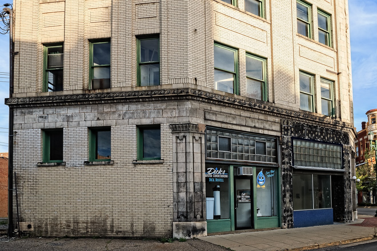The economic state of East Liverpool is strongly reflected in its downtown, where many buildings are entirely or just barely occupied. This imposing structure might at one point have been a bank or something similar, but now boasts but a single small business at ground level. The upper floors are vacant.