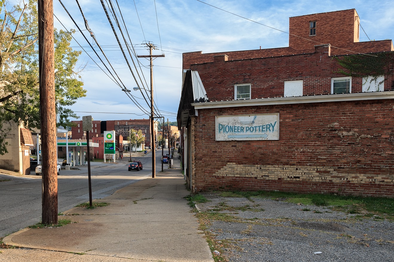 Pottery was once the life’s blood of East Liverpool. Most of those great firms—and there were a great many such great firms—are now long gone, but one that lasted for a long time was Pioneer Pottery, which began way back in 1935. It took a certain amount of bravery to start a new business in the middle of the Great Depression, but it apparently worked. However, by 2008, and the Great Recession, it was almost a one-person operation and not exactly thriving. However, it was purchased by Ulrich Honighausen, a California-based ceramics manufacturer, who turned it into a new company, American Mug and Stein, which now provides mugs to Starbucks, making it a nice little success story in a town that needs some success stories. This photo is mostly of the sign—I couldn’t get a good shot of the business itself. But it is a nice way to end this visit to East Liverpool.