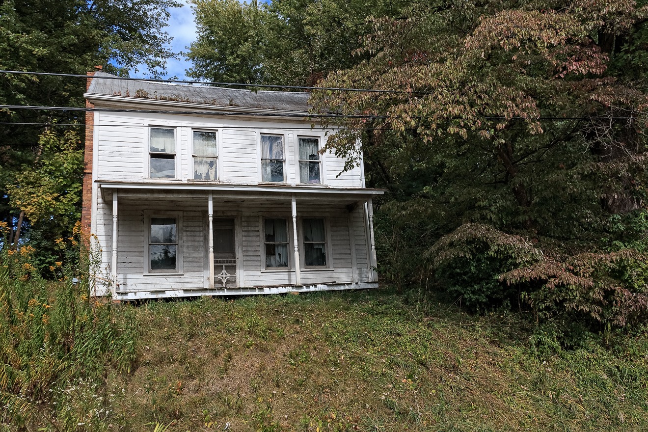 The woods and farms are punctuated by the occasional hamlet or village. In this case, we are in the blink-or-you’ll-miss-it unincorporated hamlet of Augusta in far eastern Ohio. There is no telling what this building once was, but now it seems to mainly serve as a trellis.