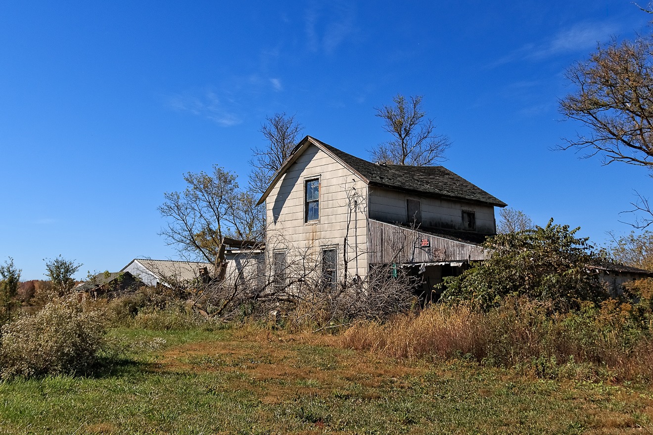 This little house on the prairie—so to speak—barely peeks over the dead corn stalks.  A not uncommon sight.