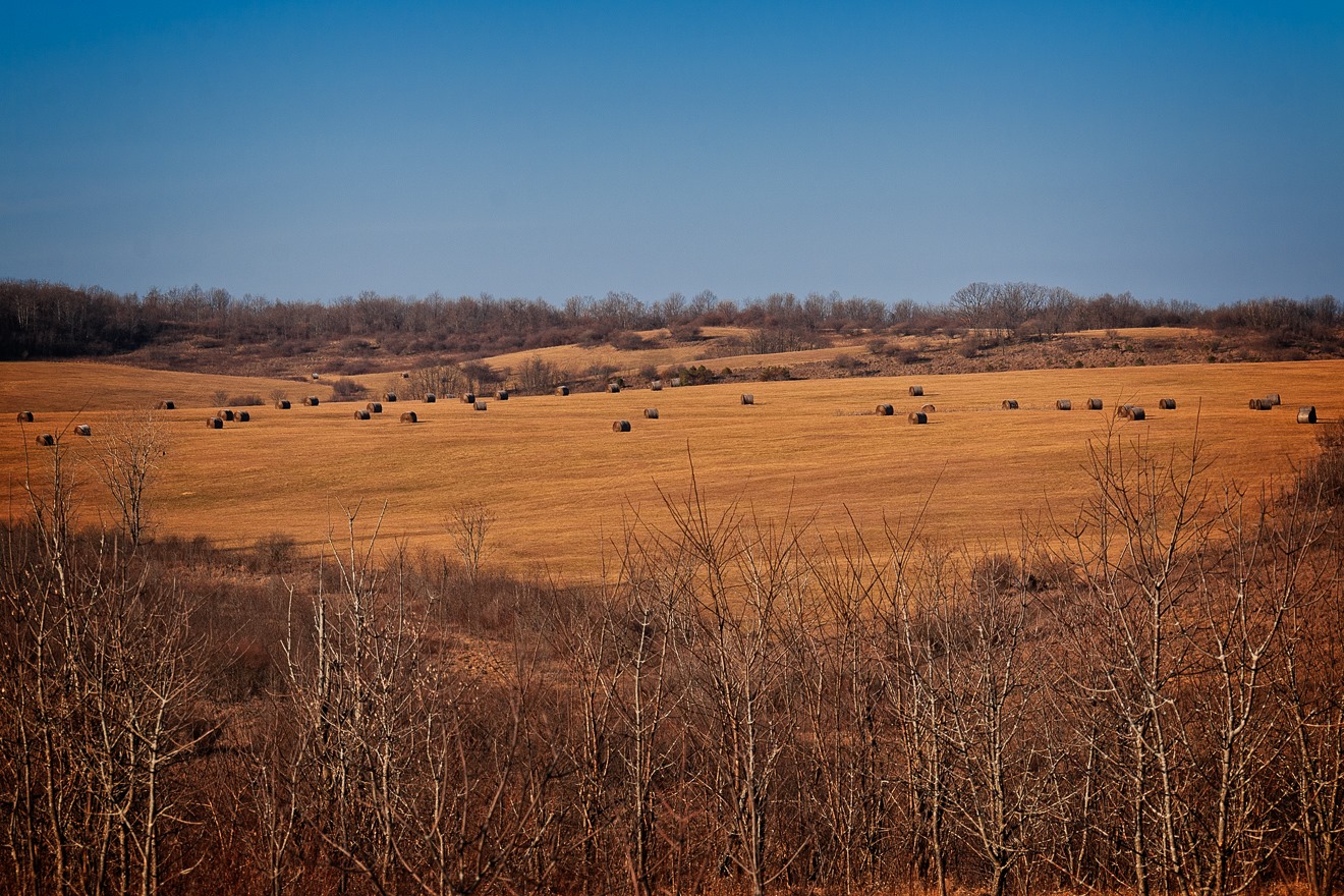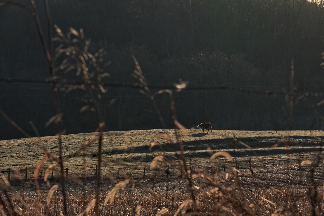 I think this photo of a lone cow out for an early morning graze sets the scene nicely.  A pasture, a wooded hill in the background, yup, we’re getting into Appalachia.  This photograph was actually taken east of Zanesville only a little south of I-70.  If you look closely at the expanded version of the photo, you can see the cow’s breath.  It was quite brisk this day.