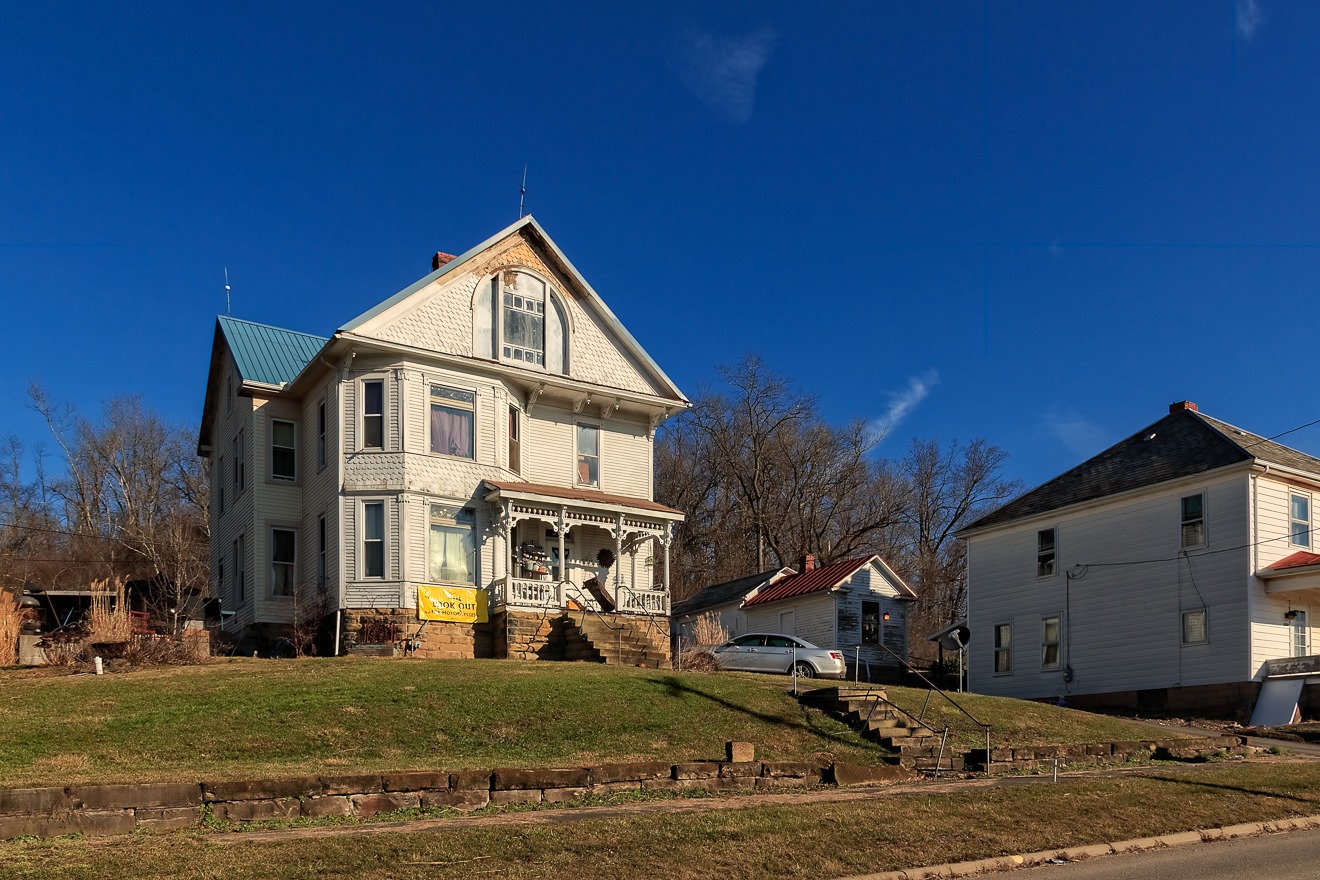 One hamlet in the center of this former strip mining “paradise” is Cumberland, Ohio.  Today it has a population of 364 (salute!) but reached the towering figure of 636 in 1920, the peak of Ohio’s coal mining boom.  Cumberland has a per capita income of only around $11,000, which makes it very poor (average for Ohio, which itself is only a middling-income state, is $21,003, almost double Cumberland’s amount).  To put that into more perspective, the poorest county in Ohio is Athens County, which has a per capita income of around $16,500.  The village of Cumberland is a third less than that.  Some of its houses, such as the one shown here, offer clues of much greater days in bygone eras.