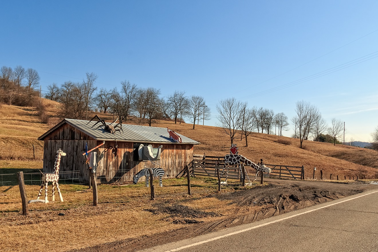 I continued east and came across this very oddly-populated structure near the speck-on-a-map called Sarahsville (population 166, salute!).  To my mind, there is one odd animal out in this scene—that ginormous fucking tarantula that looks like it is going to eat the entire menagerie.