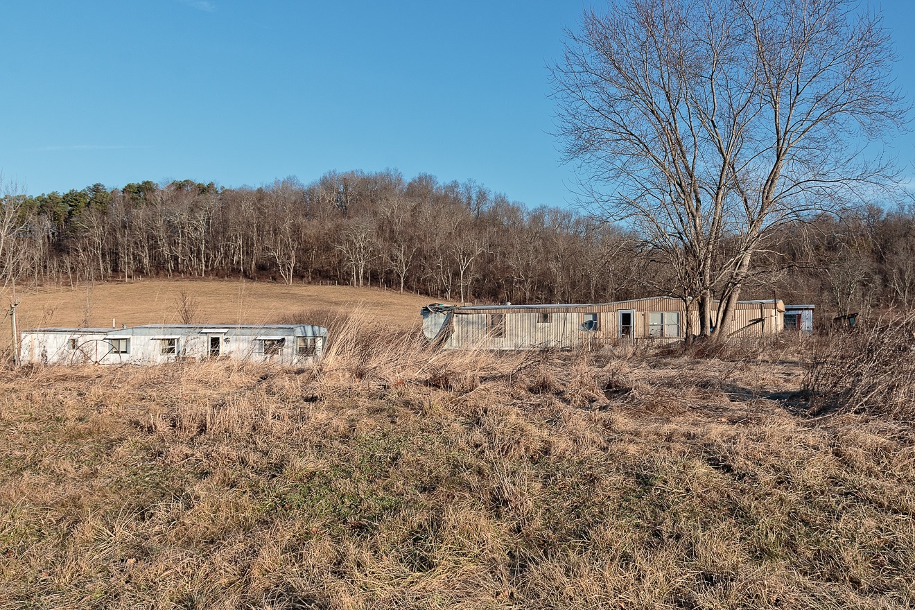 In Salt Creek Township, near the interestingly named White Eyes Creek, I came across these abandoned mobile homes—there are four in all, though they are not all visible here.  I believe they were not just dumped here but were probably lived in here at some time—satellite imagery shows a dirt driveway curving around in front of them.  However, there is a house not far to the right of the photograph that seems to share the property.  So I am not quite sure what to make of it.