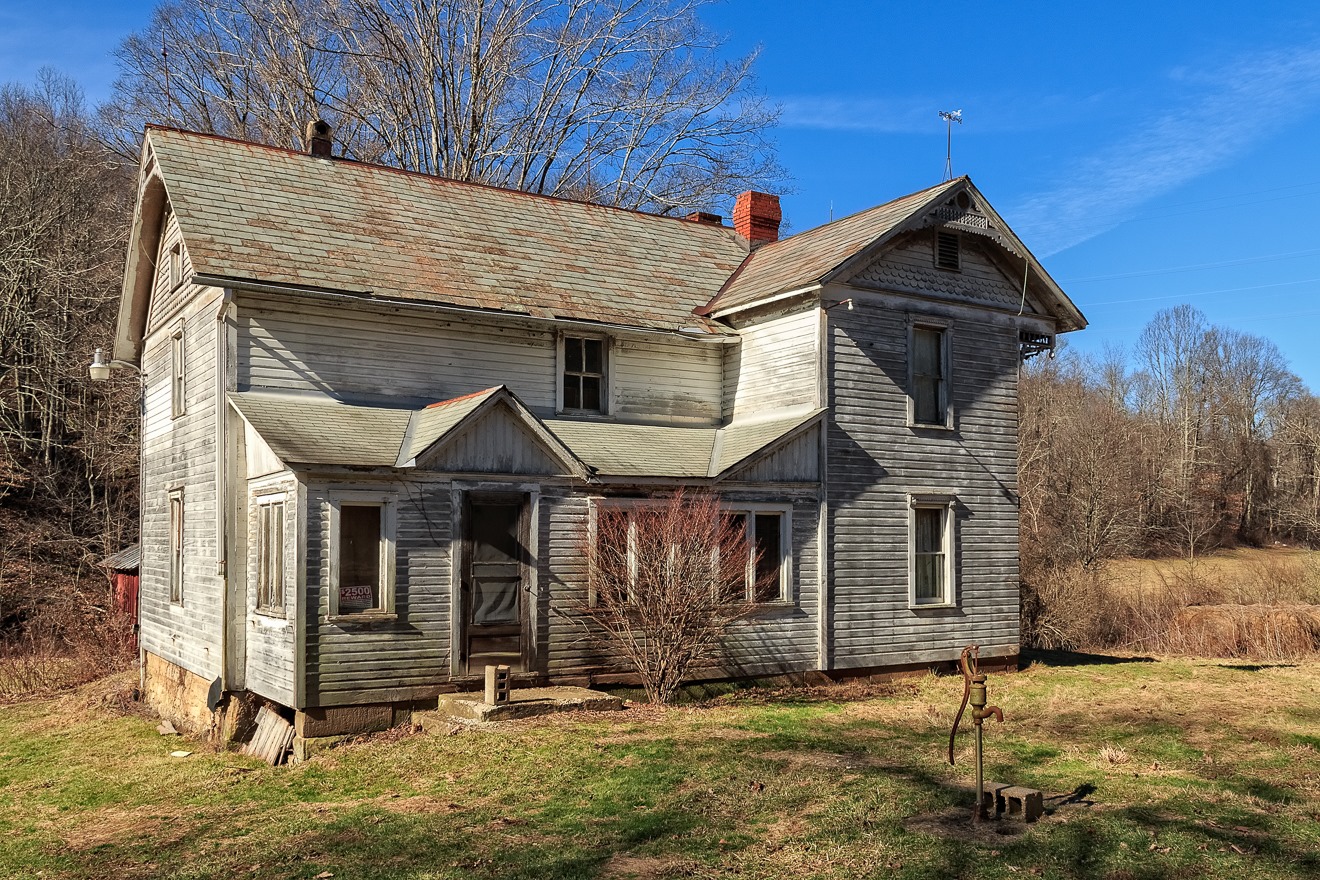 Here is the house itself.  All things considered, it could be in much worse condition.  To me, it has something of the look of an old pre-fab house.  Out of curiosity, I looked at images of old Sears catalog houses (you used to be able to buy a house through Sears and have it delivered to you—Sears was the Amazon of its day), but this design wasn’t among them.  Perhaps some other manufacturer, though?  Or perhaps I’m just plain wrong.  Note the hand water pump out in front.