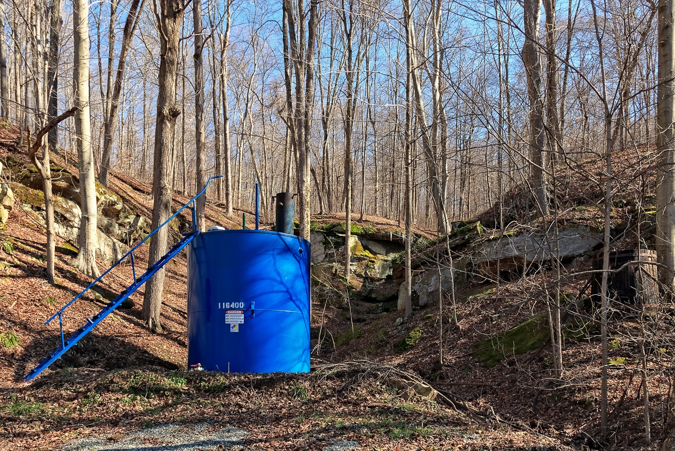 Of course, a lot of stuff that is pumped out of the ground in southeastern Ohio is oil and natural gas, and there are constant reminders of that fact.  I took a photograph of this tank because I thought the artificial blue of the tank’s paint was an interesting juxtaposition with the natural green of the moss clinging to the rocks.