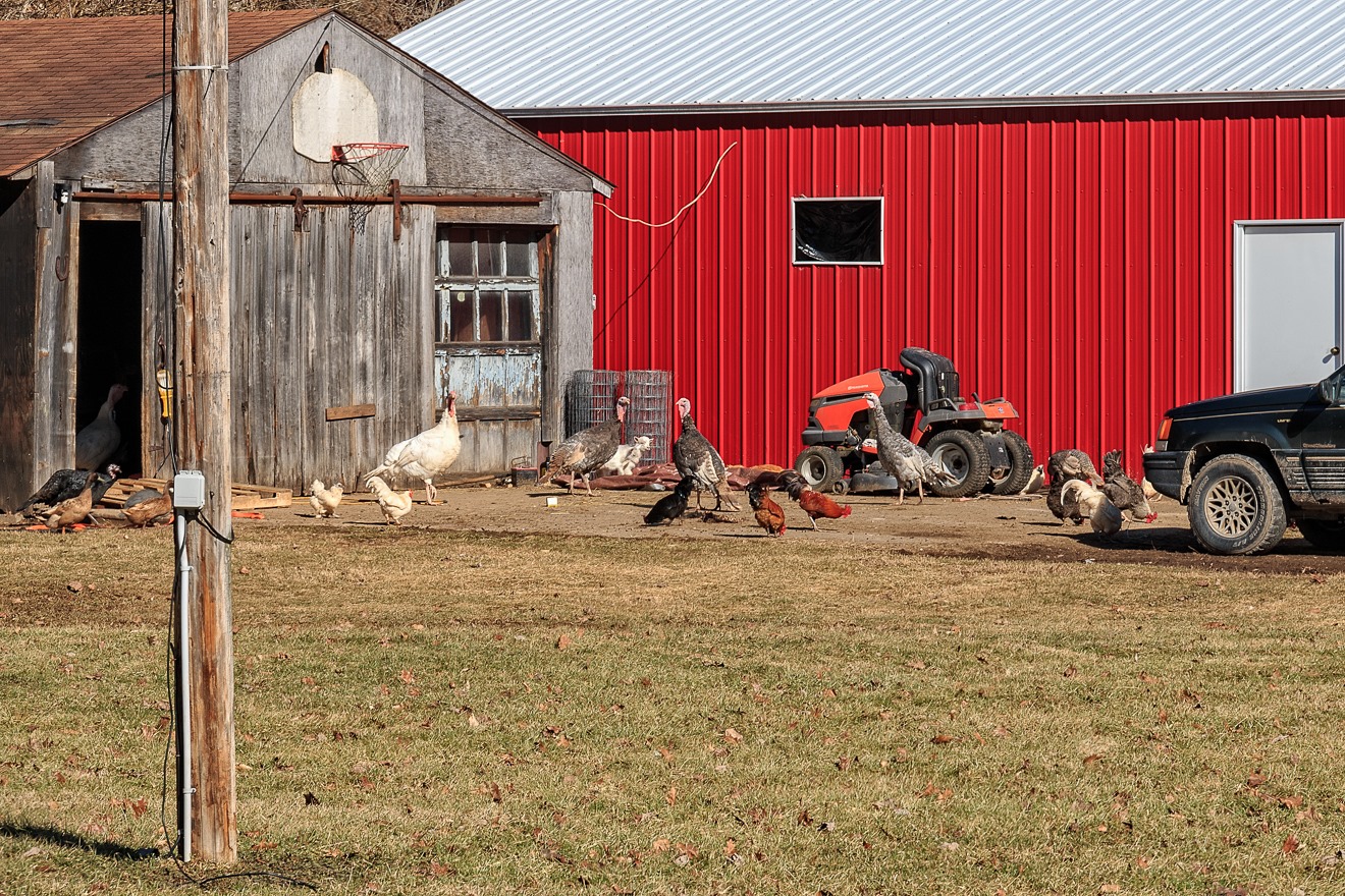 Deep in the wilds of southeast Ohio, in Washington County, I came across a lonely home at a country crossroads.  There were chickens and turkeys outside and it suddenly dawned on me that it seemed like they were playing basketball, so I took a photo.  I presume turkeys against chickens, because otherwise it’s skins vs. skins.