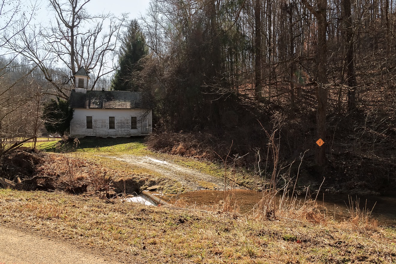 More or less across the street at this wood-surrounded crossroads was an old abandoned building.  By its architecture, I strongly suspect it to have once been a one-room schoolhouse, and if there was ever a place in Ohio that did not need more than a one-room schoolhouse, it would have been this remote area.  Note that you actually have to drive across a stream in order to get to the building.