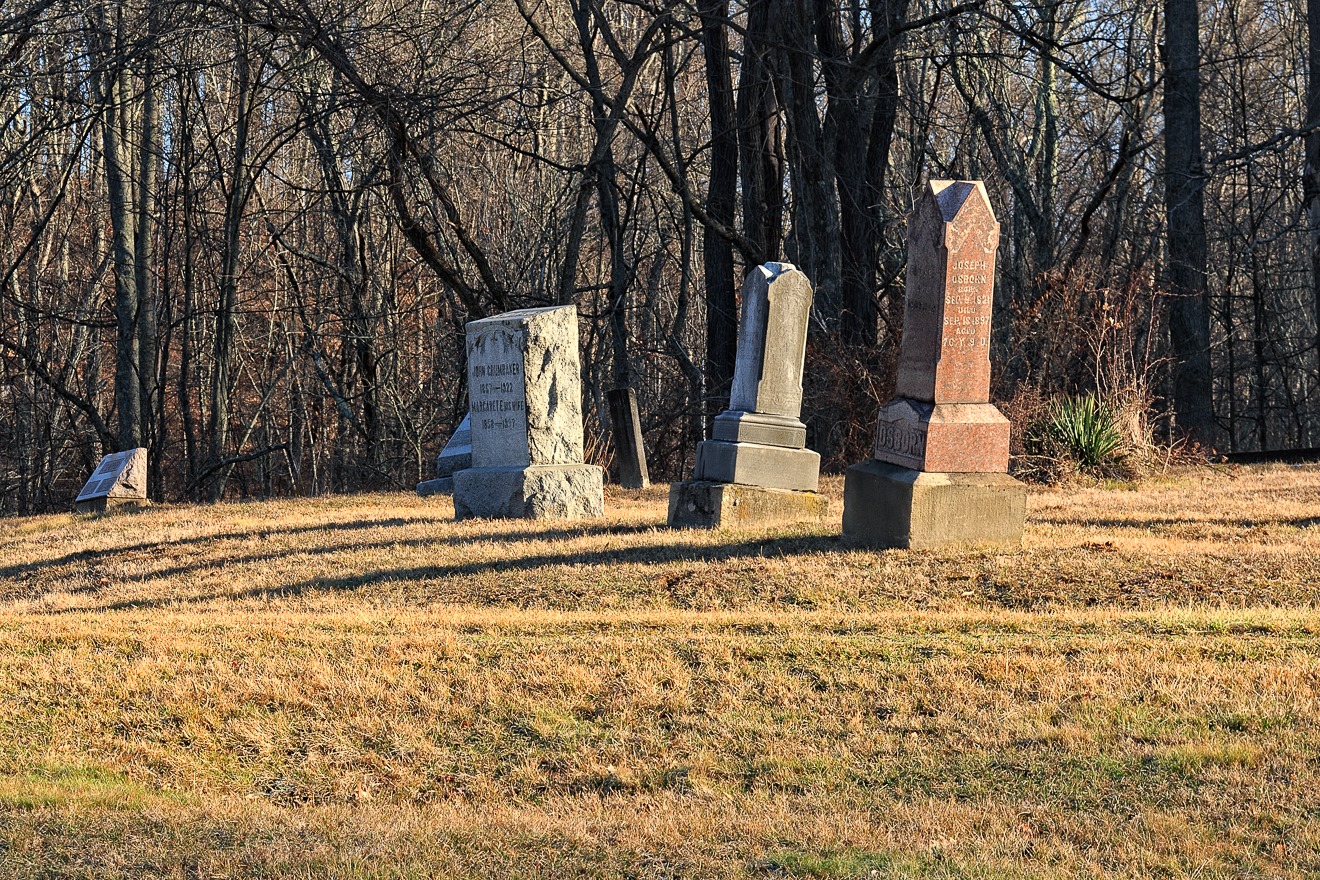 As the earlier topographical map indicates, a bit down the road from Harmony Hollow is/was something called Sugar Grove Chapel.  I can find no hint of a chapel either in my photographs or via satellite view, but there are two small cemeteries quite close to each other, and it is possible that a chapel may once have stood between them.   This is a photograph of one of them.  Note that it is not abandoned; someone, at least, keeps the grass mown.  Pictured here are three gravestones (ignore the distant one on the far let).  The one on the left belongs to John Crumbaker (1857-1922) and his wife, Margaret (1858-1937).  I can’t make out the one in the middle. The one on the right is dedicated to Joseph Osborn (1821-1897).  His wife, Sylvenia, is also buried there or nearby.  A little research reveals that Margaret Crumbaker is the daughter of Joseph Osborn.