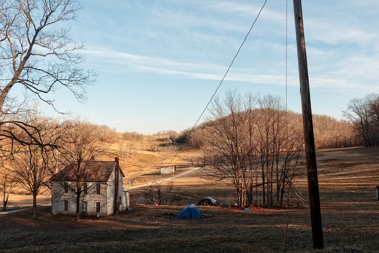 About a thousand feet to the east of the church I began to go up a little rise and took a photo of the house below me., still in the shadow of the wooded hill next to it (to the right, off camera).  My one memory in taking this photograph was how cold it was; the earth seemed rock hard.