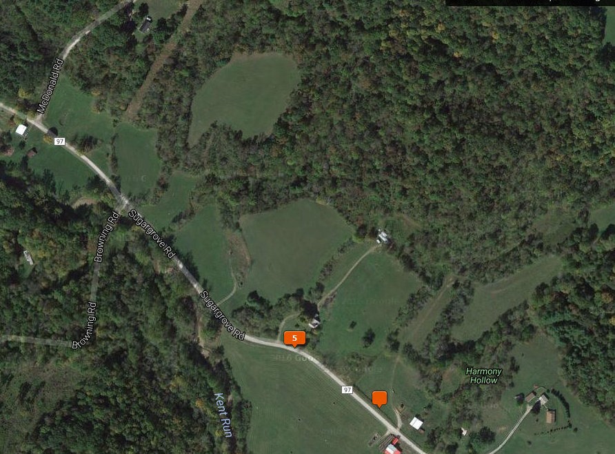 So when looked at the satellite imagery (see below; the orange square marked ‘5’ is from where I shot 5 photos of the house; the empty orange square is a GPS ghost), I noticed that Google Maps was naming something nearby with the enchanting name of Harmony Hollow. This struck me as rather odd, because there was no community or other notable feature there, like a park or cemetery.  What was this Harmony Hollow?