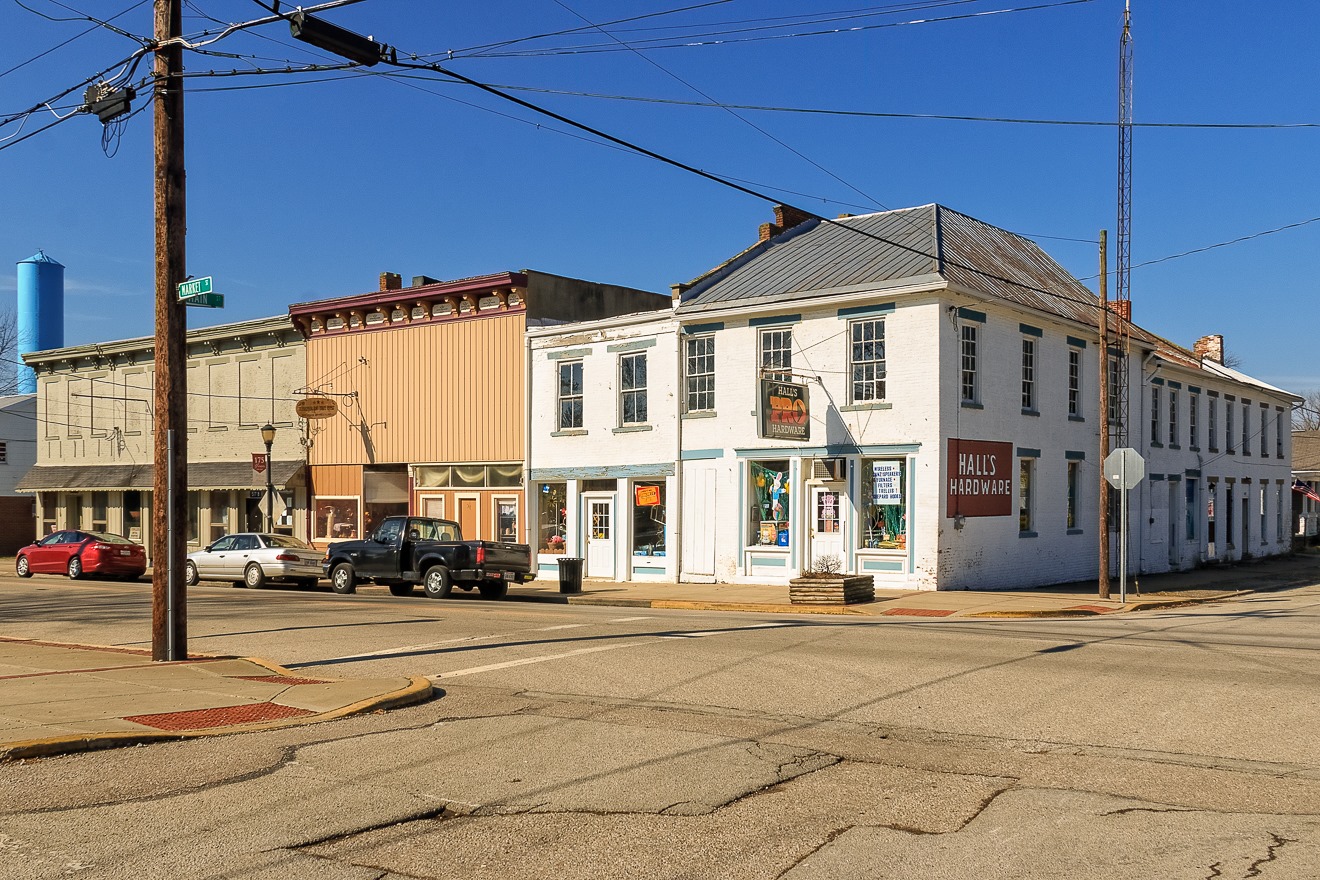 Here, in “downtown” Felicity, we see Hall’s Hardware store. Independent hardware stores are a vanishing breed in the U.S., as are even chains of small hardware stores, being destroyed by the likes of megastores such as Home Depot and Lowe’s. But small town America is where many of them have the best chance to survive. Hall’s Hardware was reportedly started in 1964, so it has been around for over half a century.