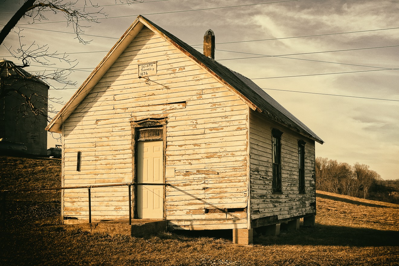 Here is a fairly well-preserved little wood building, presumably a former one-room schoolhouse. The sign over the door says “Scioto Township 1876.”
