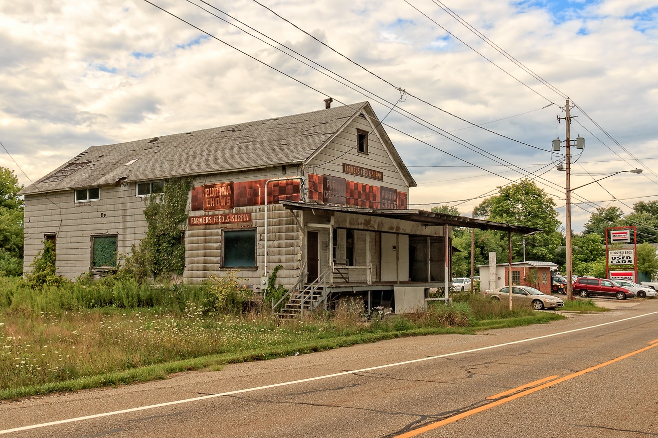 Unfortunately, my GPS failed me in one way or another shortly after the last photo, so for the rest of this entry, I do not have GPS coordinates to guide my travelogue. However, the Horodyski Brothers Used Cars sign in the background allows me to place this old feed store as being in Burghill, Ohio, a tiny unincorporated community a bit east of my previous photograph.