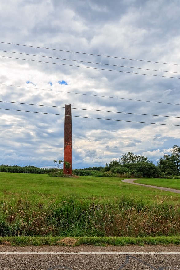 I surely wish that I had GPS coordinates for this lonely smokestack in the middle of nowhere, because I would like to see what it looks like from satellite. Obviously, whatever structure was originally here—forge, incinerator, workshop, factory—is long gone. Only the smokestack remains. One relic like this that I encountered on the other side of the state used to belong to a greenhouse. Apparently it was used to incinerate plants once produce was picked. The greenhouse was long gone but the stack remained. I wish I knew what used to be here.