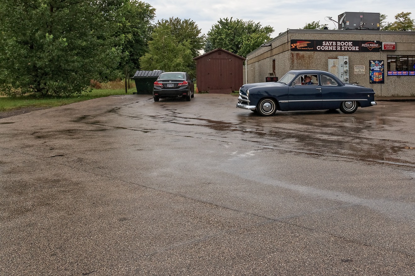 This photo gives me an opportunity to regain my bearings. Apparently I had been heading straight north through the countryside when I was taking the previous several photographs, because this photograph was taken at a gas station and convenience store only a couple of hundred yards south of Lake Erie. While getting gas here, I spotted a family in a classic car come into the gas station. It was a very nicely kept up vehicle, so I prevailed upon the man driving the vehicle to let me take a photograph. He very grumpily agreed, as if I were holding him back from an audience with the Queen.