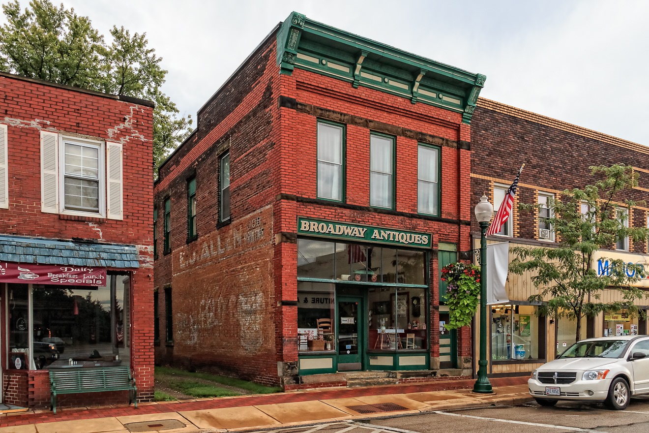 Not far from Geneva-on-the-Lake is Geneva-not-on-the-Lake, though everybody simply seems to call it Geneva, the imprecise bastards. It has a population of 6,215 (salute!). It also boasts this interesting store, the Broadway Antiques store. The building contains the remnants, almost palimpsests, of companies of yore, including what appears to be a job printer, E. O. Allen (or perhaps E. U. Allen). Sadly, the lower, larger advertisement is not clear enough for me to read, but part of it may have read “ice cream.” I am not sure.