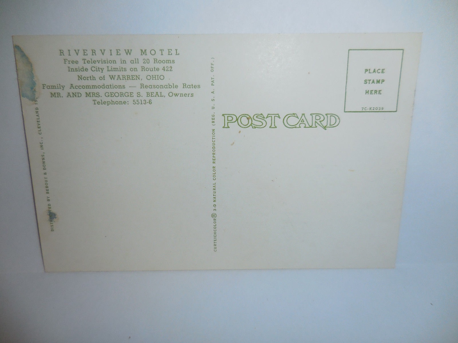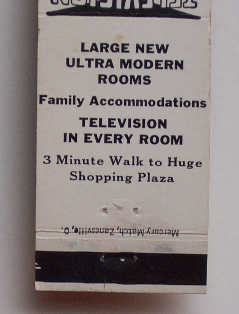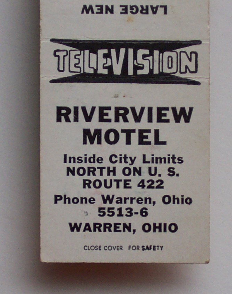 Here, just outside of Warren, Ohio (about which more below), we see one of these old structures, the Riverview Motel. I couldn’t find out when it was built, but it seems to have been around since the 1950s, at least, and always under the name Riverview Motel. I was able to find some material culture relics of the motel’s past, including a matchbook and postcard.