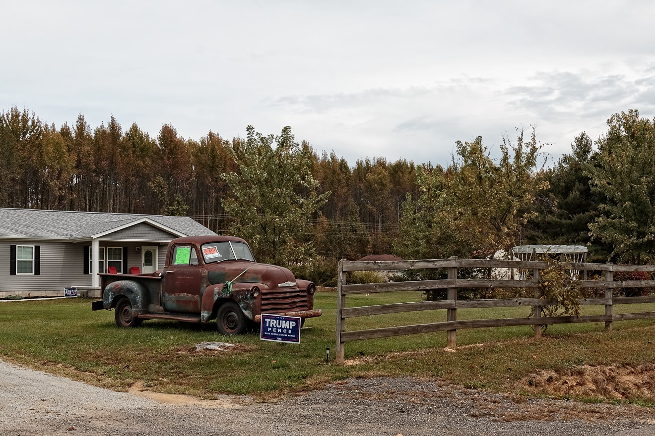 The green sign in the window says that this is a 1952 Chevy pickup, which Internet comparison quickly confirms. That truck is considerably older than I am, but about in the same shape. Note the election sign in the front yard. I quickly discovered, as I drove around eastern Ohio that October, that virtually every yard sign I would see would be a Trump sign. Appalachian Ohio had no love for Hillary Clinton—something that, unbeknownst to me, would turn out to be pretty important.
