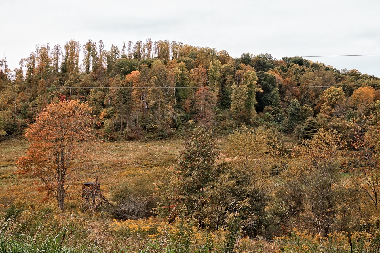I thought this was an interesting shot of a wooded hillside—and a fairly elaborate deerstand overlooking the clearing so that hunters can bag deer who come of the woods to nosh in the open.