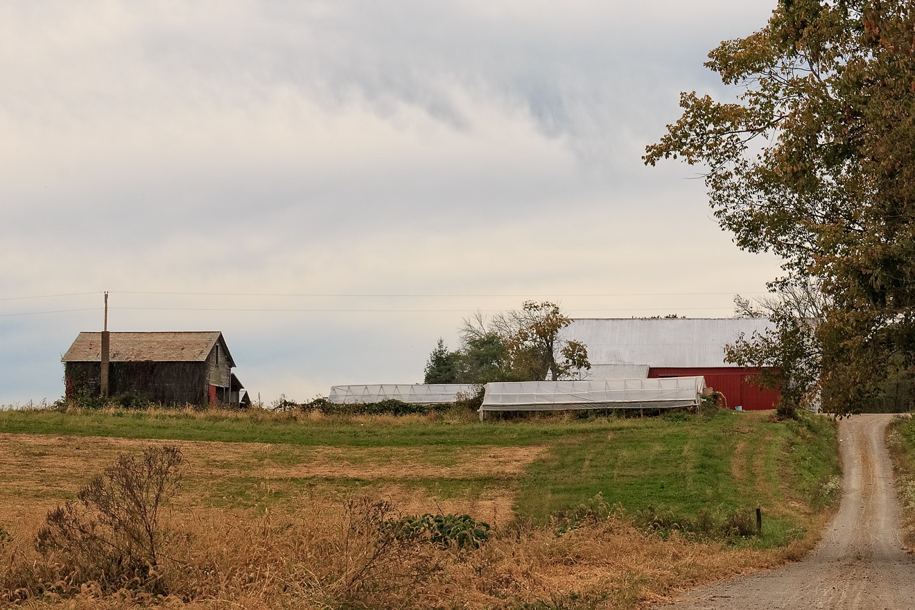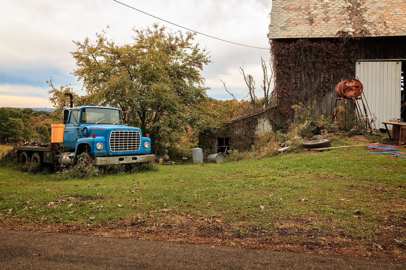 A little ways north of the hamlet of Peoli, Ohio, in Tuscarawas County , I came across an old truck and an old barn that just struck me for some reason—just a nice combination of colors, objects and textures—so I decided to document it. The cloudy day made the colors stand out well. The truck is a Ford and I think it may be an early 80s L-series truck, but identifying commercial trucks is definitely not my forte.