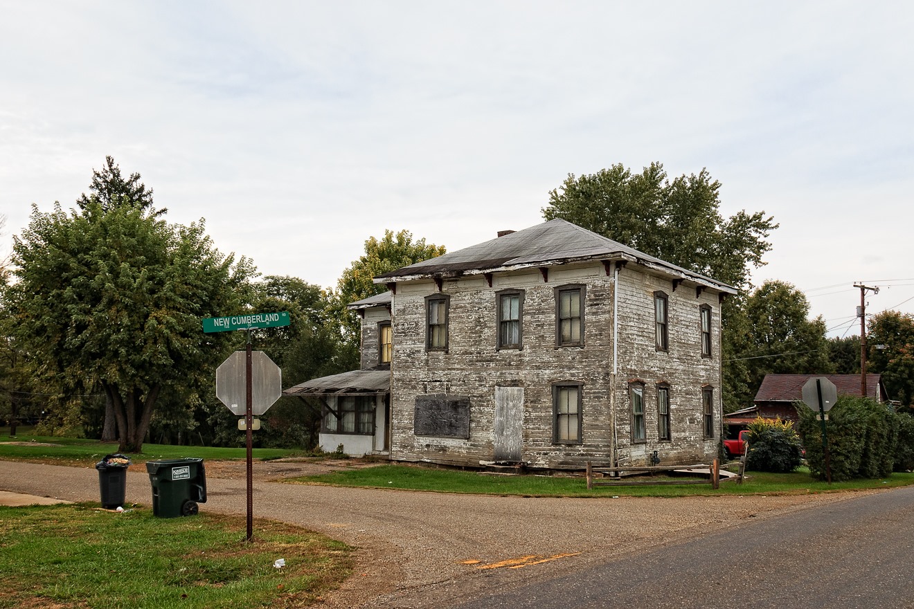 It was already quite late when I was in Carrollton, so I decided to pack things up and head home. I decided to drive south to U.S. 250 and take that west towards Columbus and home. However, on the way back, I saw something that made me pull out my camera—an ancient gas station, probably from the 1920s or 1930s. Unfortunately, I was either lazy or absent-minded or I didn’t truly realize how dark it had become. I took a few quick shots. I may have used the window mount but I didn’t really bother to set a long exposure or do any of the things I really had ought to have done to take a good low-light photo. The results were, I found out, crap, and it was only by dint of considerable effort that I was able to pull out even this half-assed salvage job, which I show here only for the intrinsic interest of the old filling station and not because the photo itself has any merit to it.