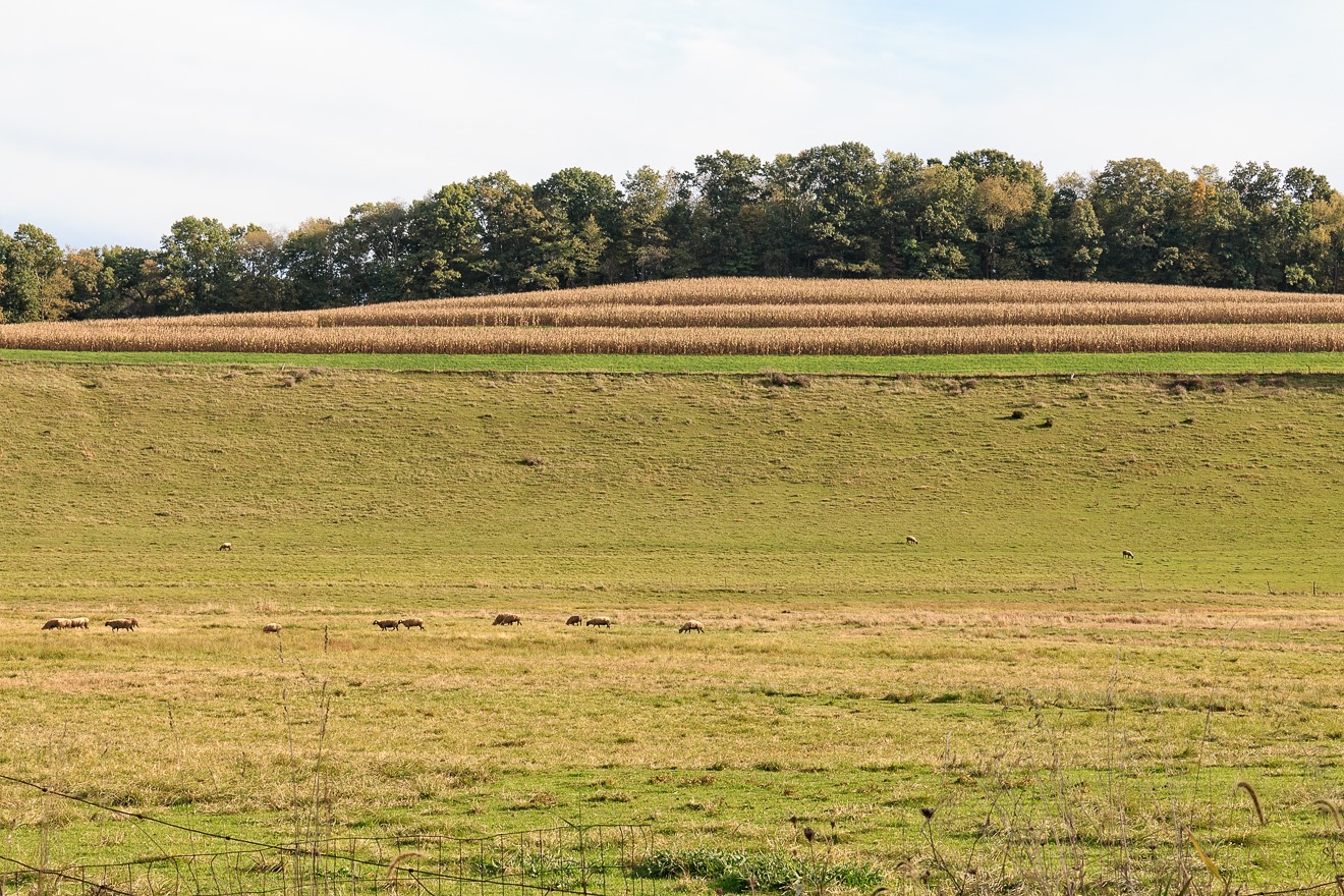 Here’s an example of a common practice in eastern Ohio in which farming is done in strips—typically long sections of corn alternating with something else, such as hay. When the hay is cut and the corn remains, you get an odd layered look (when viewed from the side).