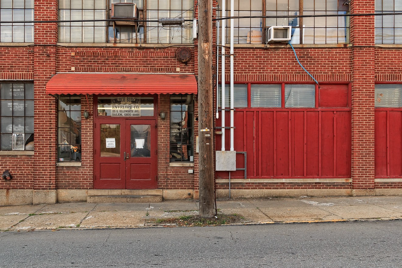 Tsuki and I continued our drive and wound up in Salem, Ohio, one of my favorite towns (population 12,303, salute!) to photograph, with many interesting old buildings and a generally attractive look and feel. On this visit, one place I got to photograph was the interestingly-named Church Budget Envelope Company. By church, they mean exactly that: churches. The company motto is “Serving churches devoted to the Loving Spirit of our Lord Jesus Christ,” and its website actually has two versions—a Protestant version and a Catholic version.