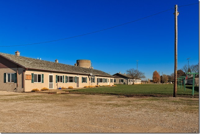 Just a bit west of Plymouth I came across the first sign that something was up when I drove past a long, low barracks-like building. I wondered if it might have been an old motor hotel from the early 1900s, so I found a place to turn around and drove back to examine it. It was clearly no motel; motels do not have sets of clotheslines out back. My next guess was that it was some sort of kid’s camp or church camp, closed for the winter season, of course.