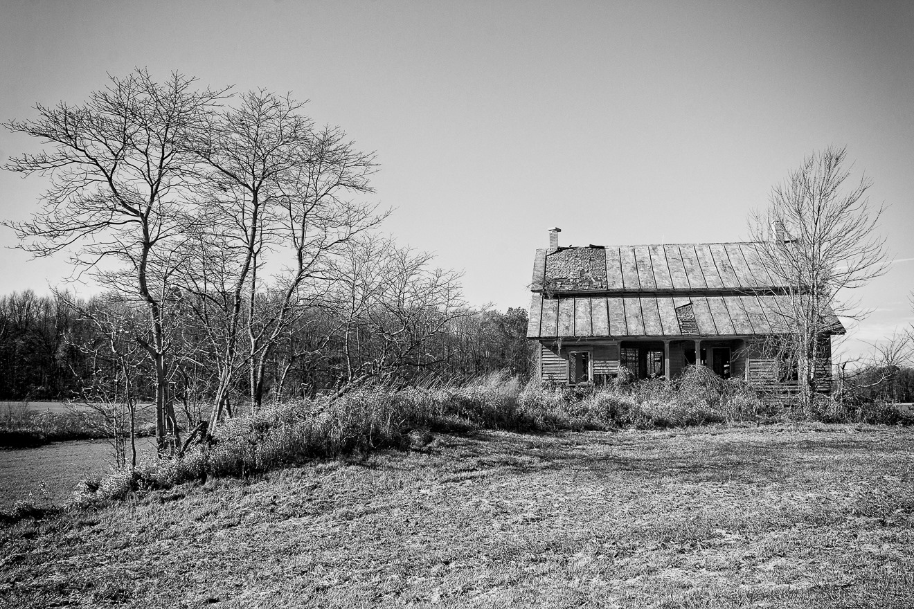 Here is a color version, which also works well, I think. The composition is much better than the previous cabin, because I had more angles I could work with—and this cabin was not so far away. I could also arrange the composition so that there was a clearly delineated foreground and background, while there was grass and brush instead of corn stubble to fill the open spaces—not to mention the spindly trees. I like this photo, in both its versions. This cabin is located northwest of the village of New Washington.
