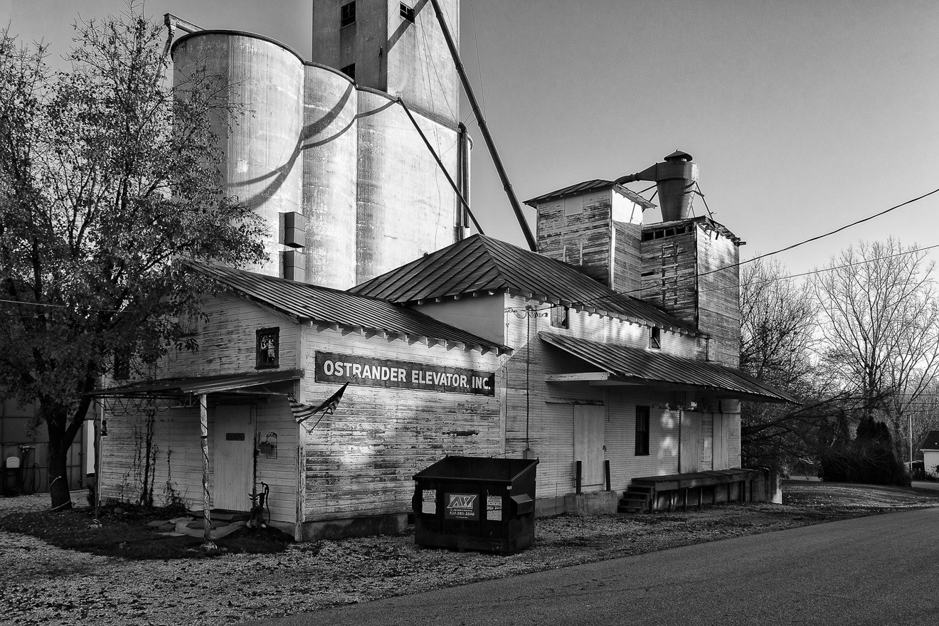 Halfway between those two bedroom communities for Columbus is Ostrander, Ohio, a small and sleepy hamlet (population 643, salute!) which aggregated around a railroad stop (the railroad itself stopped running in the 1970s). Ostrander is somewhat older than it looks, because in the 1920s a fire destroyed all the buildings on the main square, so the buildings one sees all essentially date after that point. The most visible part of Ostrander is the large grain elevator there (and above), constructed by the Ostrander Farmers Exchange. The Ostrander Elevator Company dates at least to around 1903. In 1918 it was run by M. R. Hays and H. F. Vallance. I’m curious how old this building is. Note the water pump next to the left-hand porch.