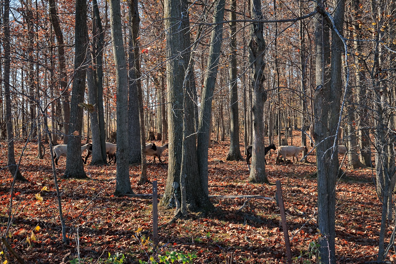 Sometimes people will let patches of woods remain around their homes, giving the homes a woodland feel, even if open fields are only a hundred or two hundred yards away. I was driving alongside one such patch when I caught movement out of the corner of my eyes and discovered a line of sheep winding their way back home in the afternoon after having spent a busy day grazing. This is the second time in my excursions that I have just suddenly had a winding line of sheep appear (I also once had a flock that had broken through a fence block the road I was on).